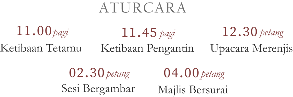 Dengan segala hormatnya mempersilakan Tan Sri/ Puan Sri/Dato’ Seri/ Datin Seri/ Dato/ Datin/ Tuan/ Puan/ Encik/ Cik ke majlis resepsi Putera kami